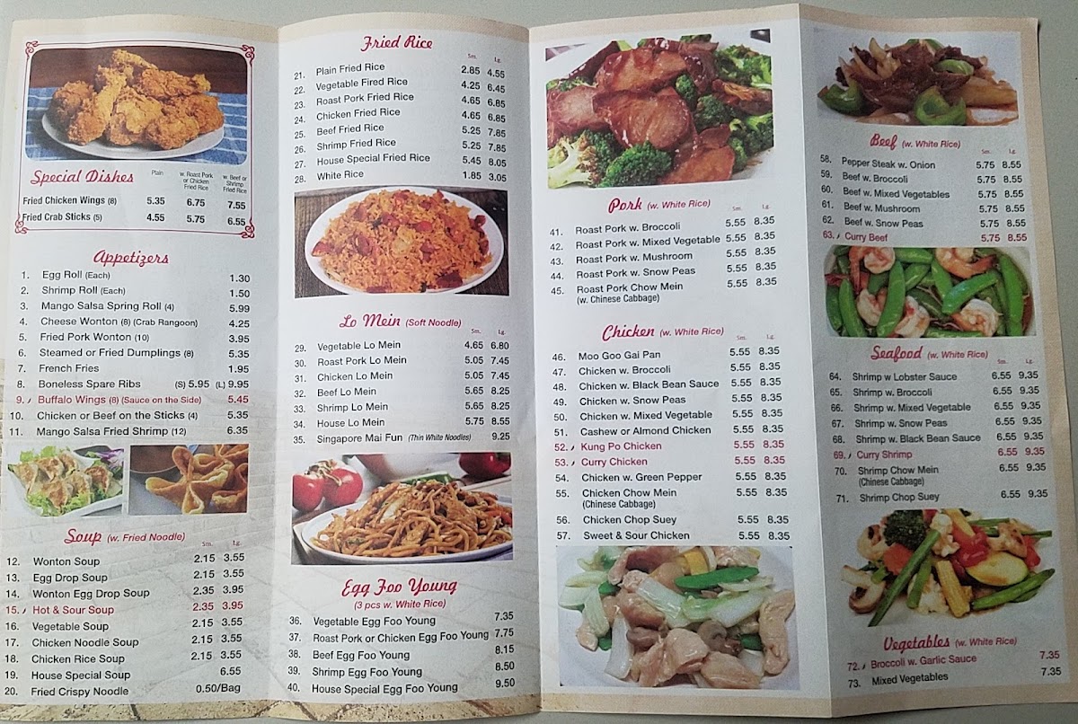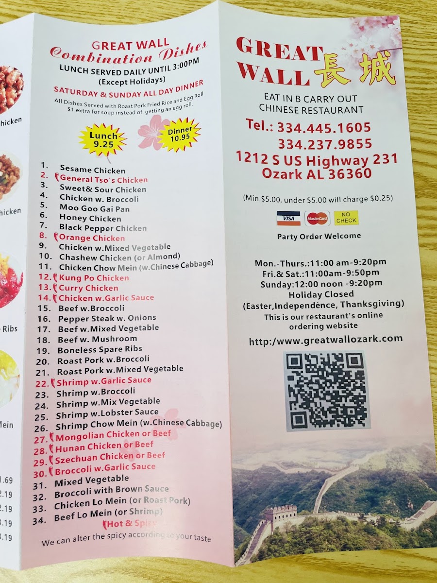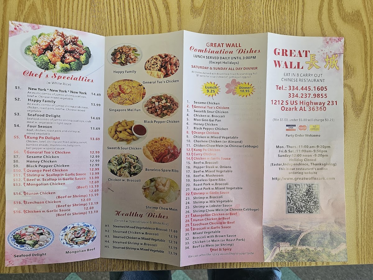 From a reviewer’s perspective, the menu at Great Wall Chinese Restaurant at 1212 US-231, Ozark, AL offers a well-rounded and familiar journey through classic Chinese-American cuisine, making it easy for diners to find both comfort and variety. The Chicken selection highlights popular staples like Kung Pao Chicken, Chicken Chow Mein, and Curry Chicken, each appealing to different taste preferences, from savory to mildly spicy. Starting the meal, the Appetizers such as Steamed Dumplings (8)/水饺, Buffalo Wings (8), and Cheese Wonton (8)/气吞 provide satisfying, shareable options. The Soup choices-including Hot & Sour Soup, House Special Soup, Wonton Egg Drop Soup, Wonton Soup, and Chicken Noodle Soup-add warmth and balance to the menu. For noodle lovers, Vegetable Lo Mein, Singapore Mai Fun, Beef Lo Mein, Roast Pork Lo Mein, and Chicken Lo Mein deliver hearty portions suitable for any appetite. Value is clearly emphasized through the Dinner Combo selections like (C) Garlic Sauce With Choice Of Protein/鱼香, (C) Szechuan Style/四川, (C) Kung Pao Chicken/宫鸡, (C) Curry Chicken/咖喱鸡, and (C) Orange Chicken/陈鸡, while the Chef Special section elevates the experience with dishes such as Beef & Scallop In Garlic Sauce/大鱼干贝牛, Szechuan Style/大四川, Orange Chicken/大陈鸡, Seafood Delight/海鲜大会, and General Tso's Chicken/大佐鸡. The menu is further completed by Seafood items like Curry Shrimp and Shrimp Chow Mein, Beef options such as Curry Beef, Pork favorites like Roast Pork Chow Mein, fresh Vegetables with Broccoli With Garlic Sauce, and convenient Lunch Specials including (L) Mongolian Style, (L) Garlic Sauce With Choice Of Protein, (L) Orange Chicken, (L) Hunan Style, and (L) Kung Pao Chicken. Overall, the menu feels thoughtfully assembled, combining variety, familiarity, and value, making Great Wall Chinese Restaurant a reliable choice for casual dining in Ozark.