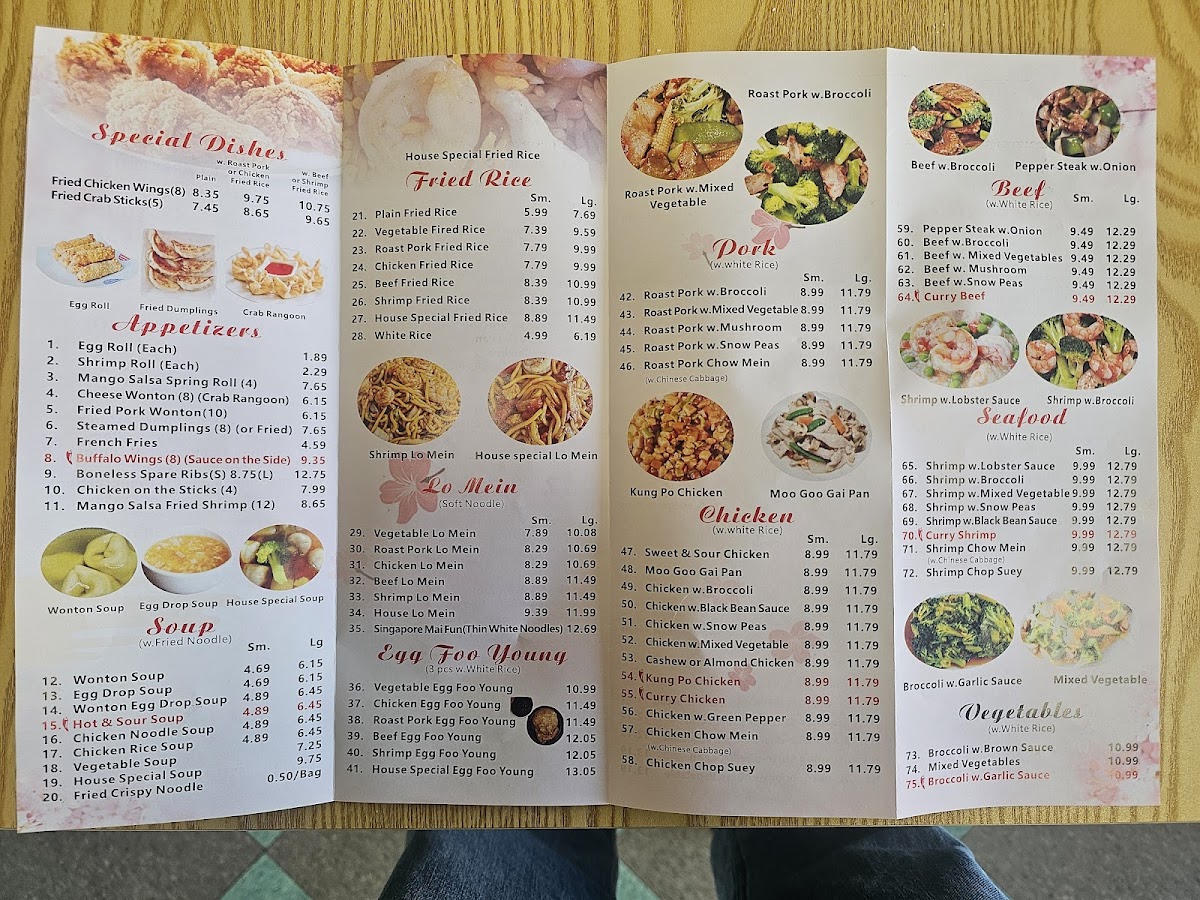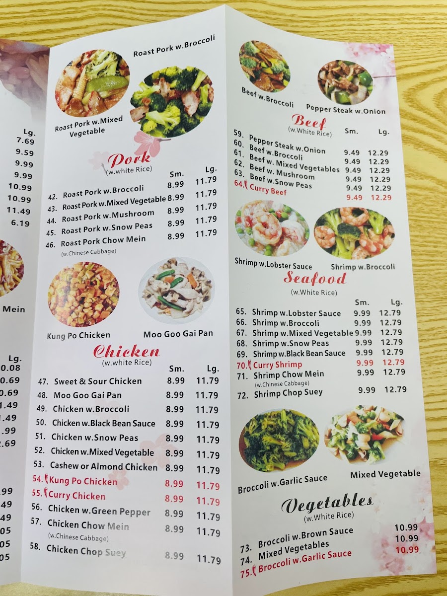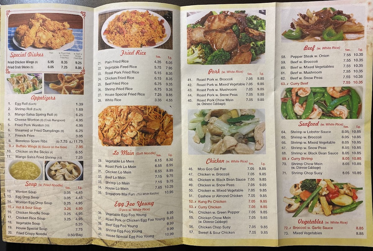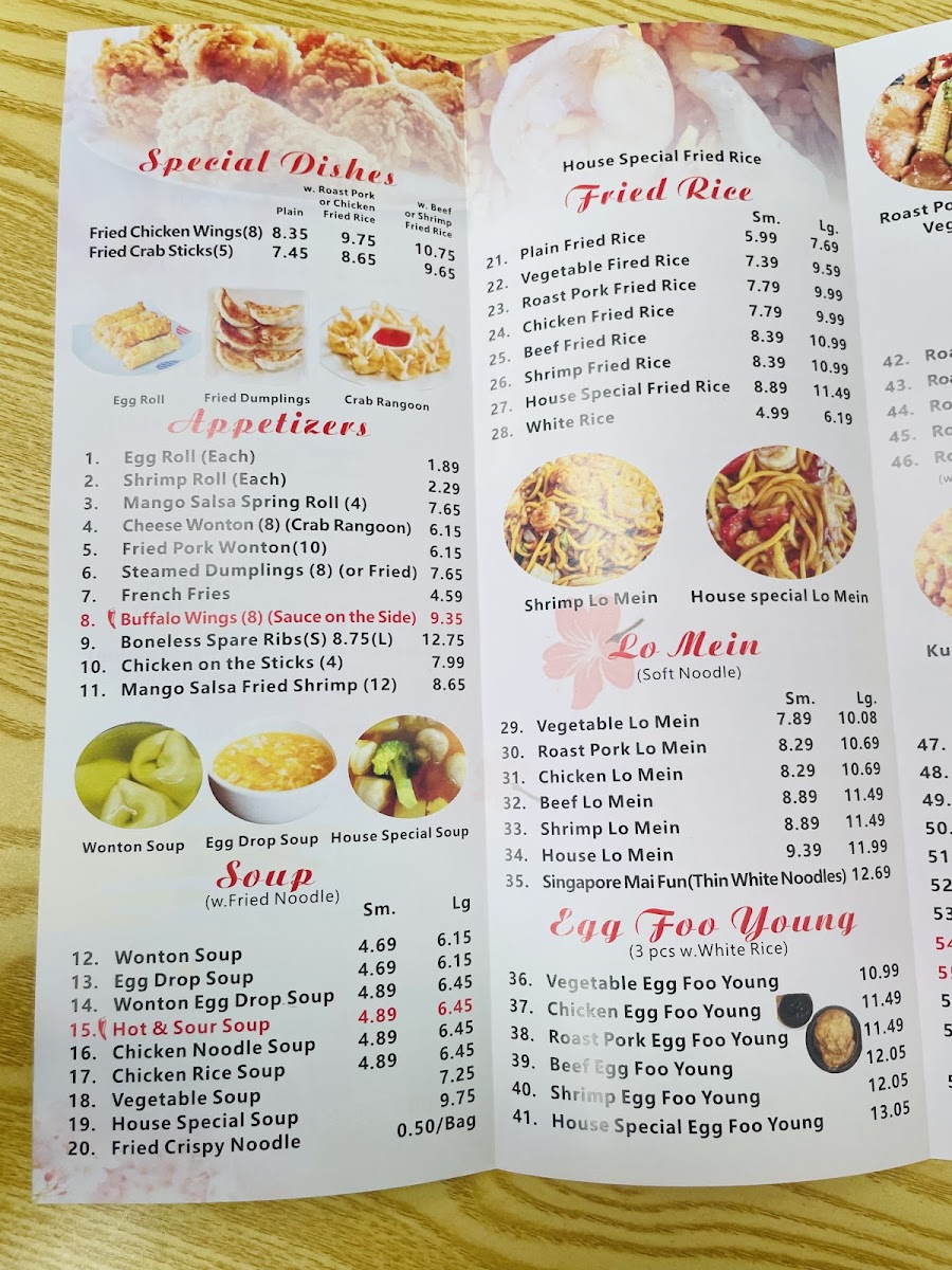 From a reviewer’s perspective, the menu at Great Wall Chinese Restaurant at 1212 US-231, Ozark, AL offers a well-rounded and familiar journey through classic Chinese-American cuisine, making it easy for diners to find both comfort and variety. The Chicken selection highlights popular staples like Kung Pao Chicken, Chicken Chow Mein, and Curry Chicken, each appealing to different taste preferences, from savory to mildly spicy. Starting the meal, the Appetizers such as Steamed Dumplings (8)/水饺, Buffalo Wings (8), and Cheese Wonton (8)/气吞 provide satisfying, shareable options. The Soup choices-including Hot & Sour Soup, House Special Soup, Wonton Egg Drop Soup, Wonton Soup, and Chicken Noodle Soup-add warmth and balance to the menu. For noodle lovers, Vegetable Lo Mein, Singapore Mai Fun, Beef Lo Mein, Roast Pork Lo Mein, and Chicken Lo Mein deliver hearty portions suitable for any appetite. Value is clearly emphasized through the Dinner Combo selections like (C) Garlic Sauce With Choice Of Protein/鱼香, (C) Szechuan Style/四川, (C) Kung Pao Chicken/宫鸡, (C) Curry Chicken/咖喱鸡, and (C) Orange Chicken/陈鸡, while the Chef Special section elevates the experience with dishes such as Beef & Scallop In Garlic Sauce/大鱼干贝牛, Szechuan Style/大四川, Orange Chicken/大陈鸡, Seafood Delight/海鲜大会, and General Tso's Chicken/大佐鸡. The menu is further completed by Seafood items like Curry Shrimp and Shrimp Chow Mein, Beef options such as Curry Beef, Pork favorites like Roast Pork Chow Mein, fresh Vegetables with Broccoli With Garlic Sauce, and convenient Lunch Specials including (L) Mongolian Style, (L) Garlic Sauce With Choice Of Protein, (L) Orange Chicken, (L) Hunan Style, and (L) Kung Pao Chicken. Overall, the menu feels thoughtfully assembled, combining variety, familiarity, and value, making Great Wall Chinese Restaurant a reliable choice for casual dining in Ozark.